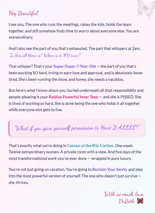Most therapy and workshops work from the neck up. DrBeth works with the whole you, the parts that logic can't reach. The Inner Family Zoo approach gets to the ROOT of why you keep doing what you keep doing, even when you know better. Plus, you're doing it in Cancun at the Ritz-Carlton with 11 other extraordinary women. That's not therapy. That's a revolution.